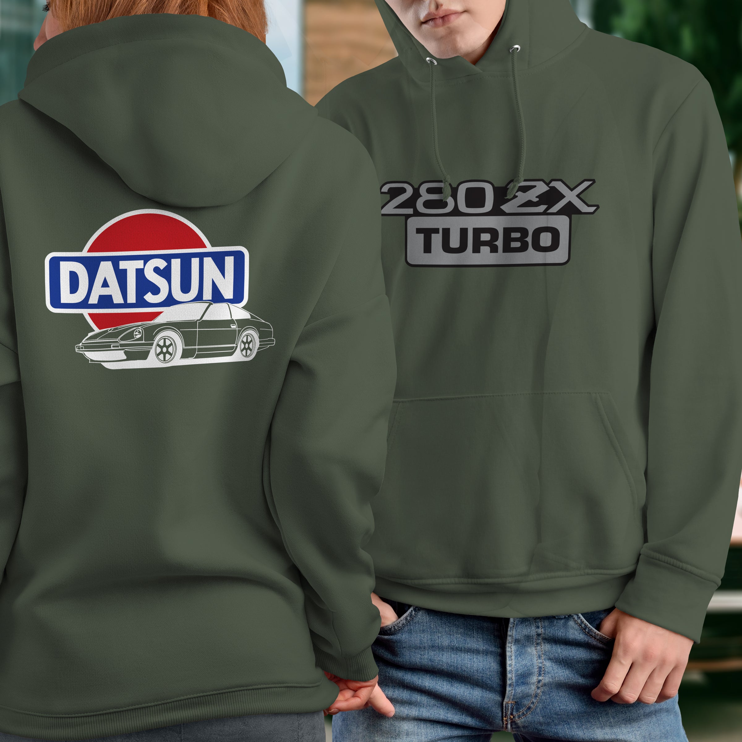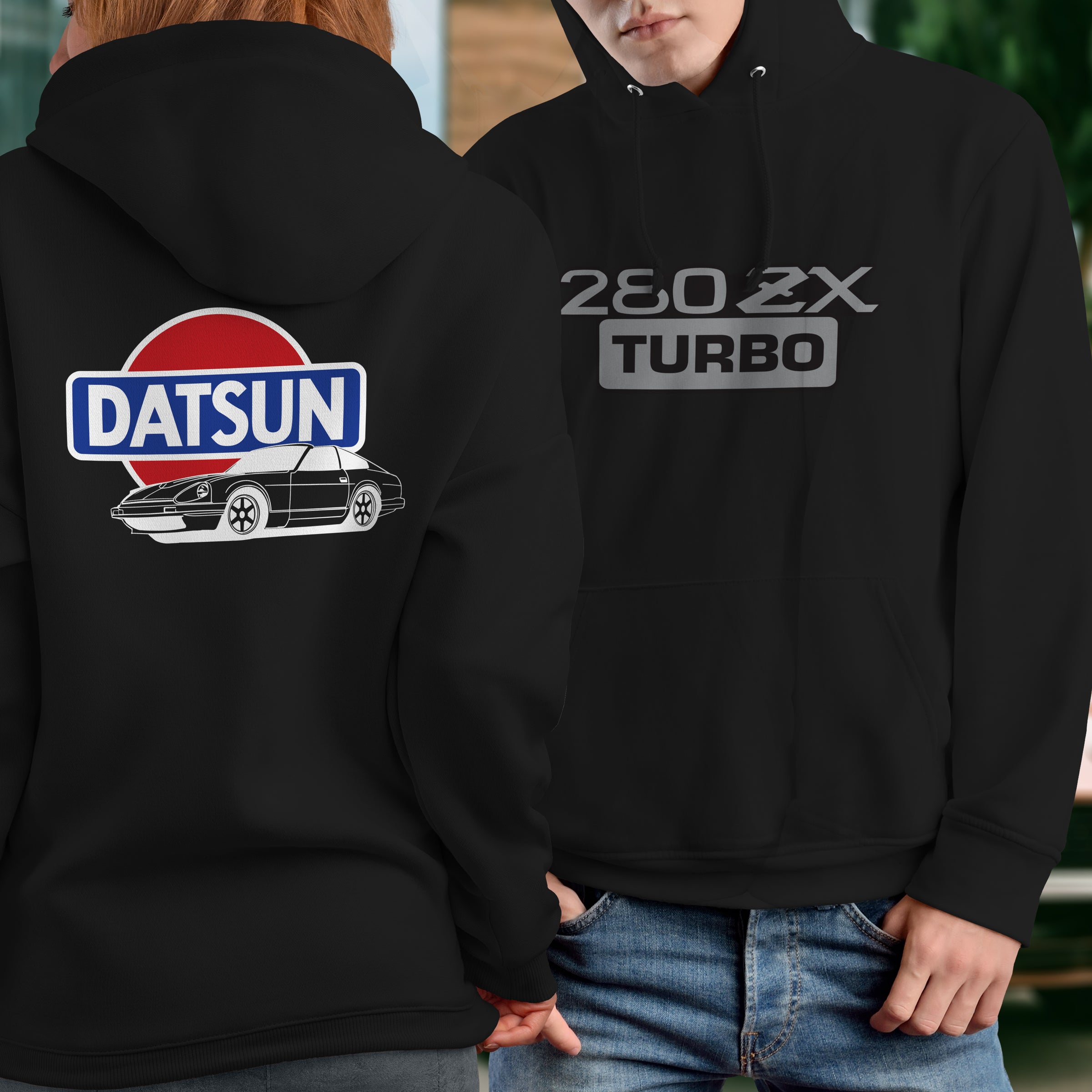 Datsun 280ZX Turbo Logo Hoodie. Hoodies are Preshrunk 50% Cotton/50% Polyester blend with a heat pressed digital printed image. Hoodies are custom made to order.