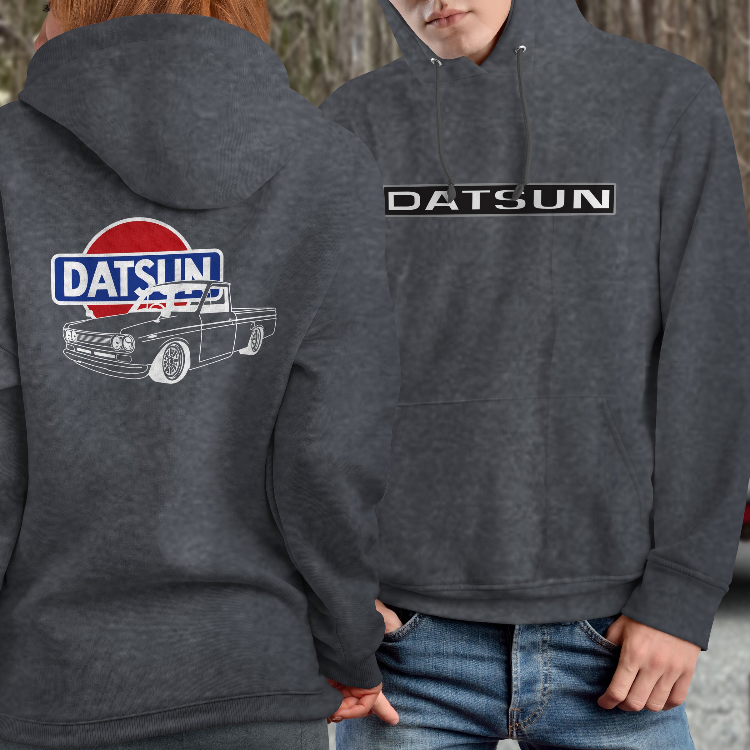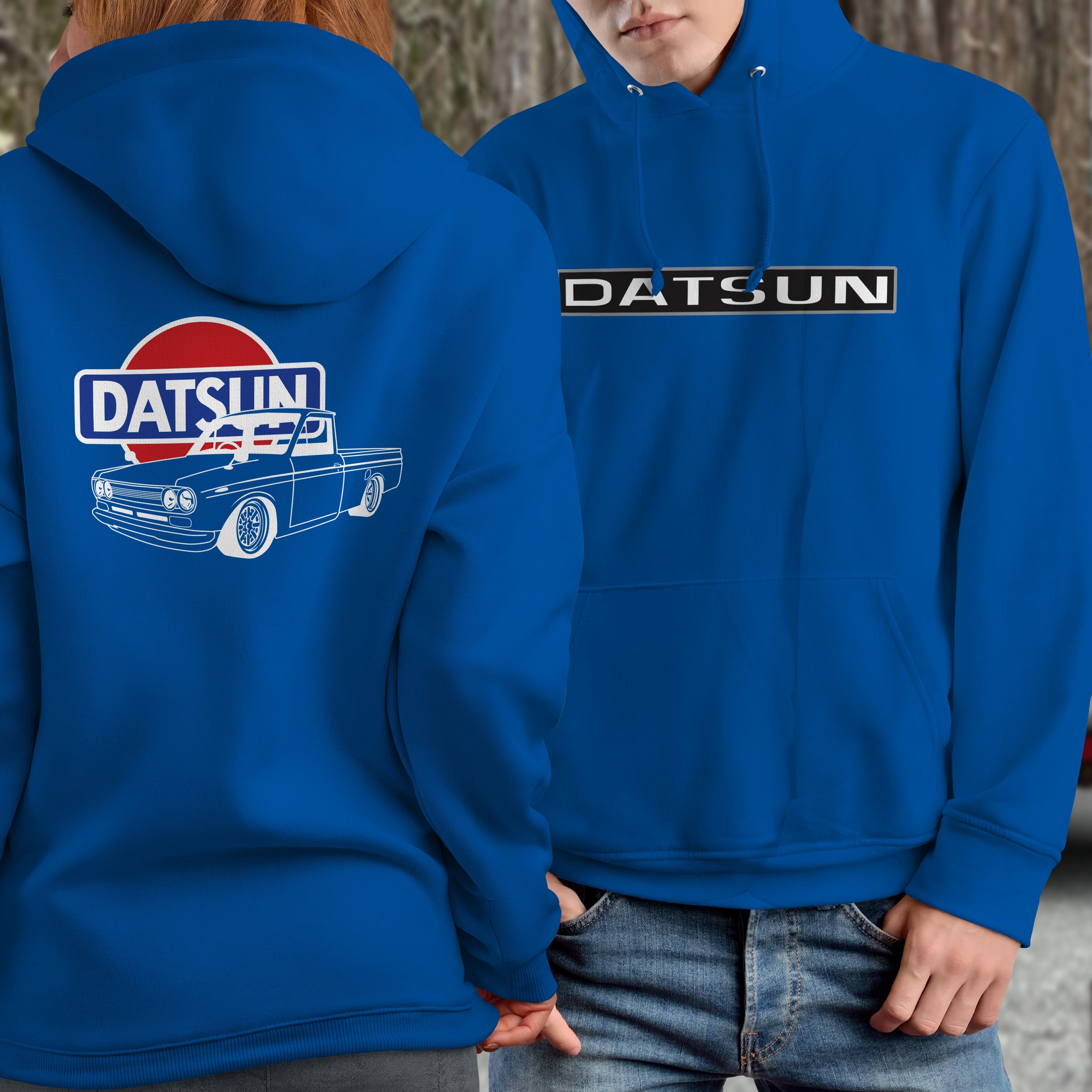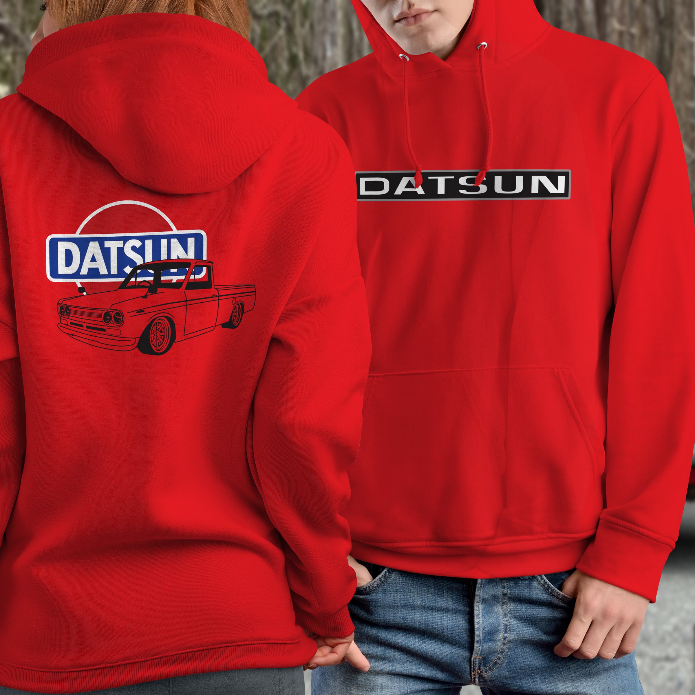 Datsun 521 Logo Hoodie. Hoodies are Preshrunk 50% Cotton/50% Polyester blend with a heat pressed digital printed image. Hoodies are custom made to order.