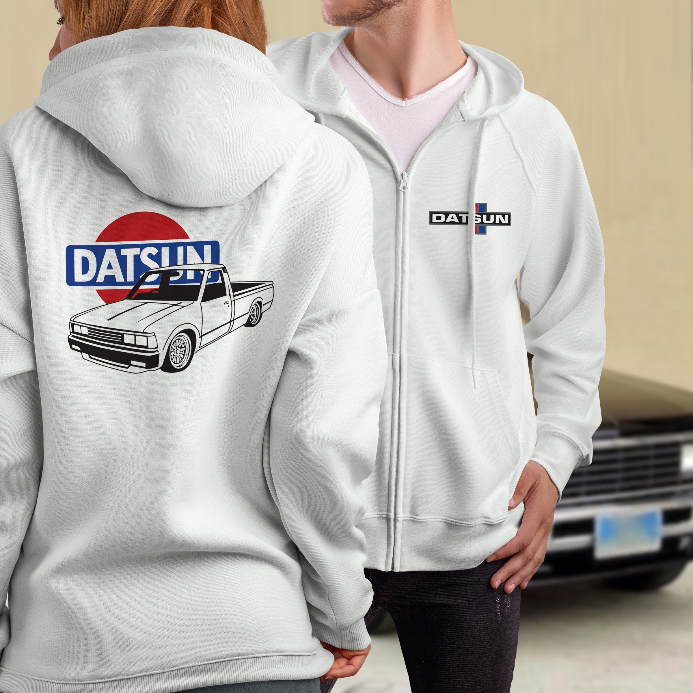 Datsun 720 Logo Full Zip Hoodie.  Hoodies are Preshrunk 50% Cotton/50% Polyester blend with a heat pressed digital printed image.  Hoodies are custom made to order.