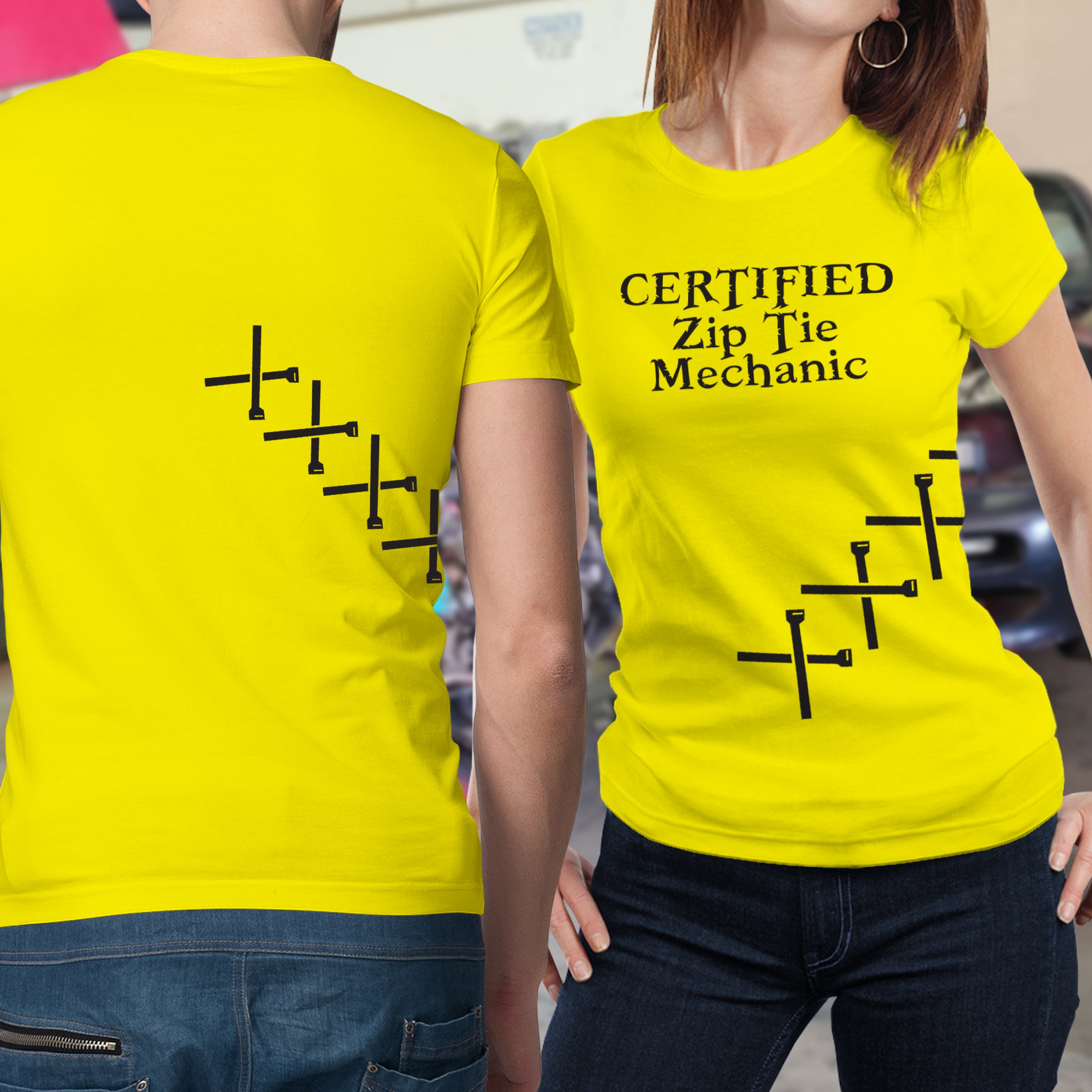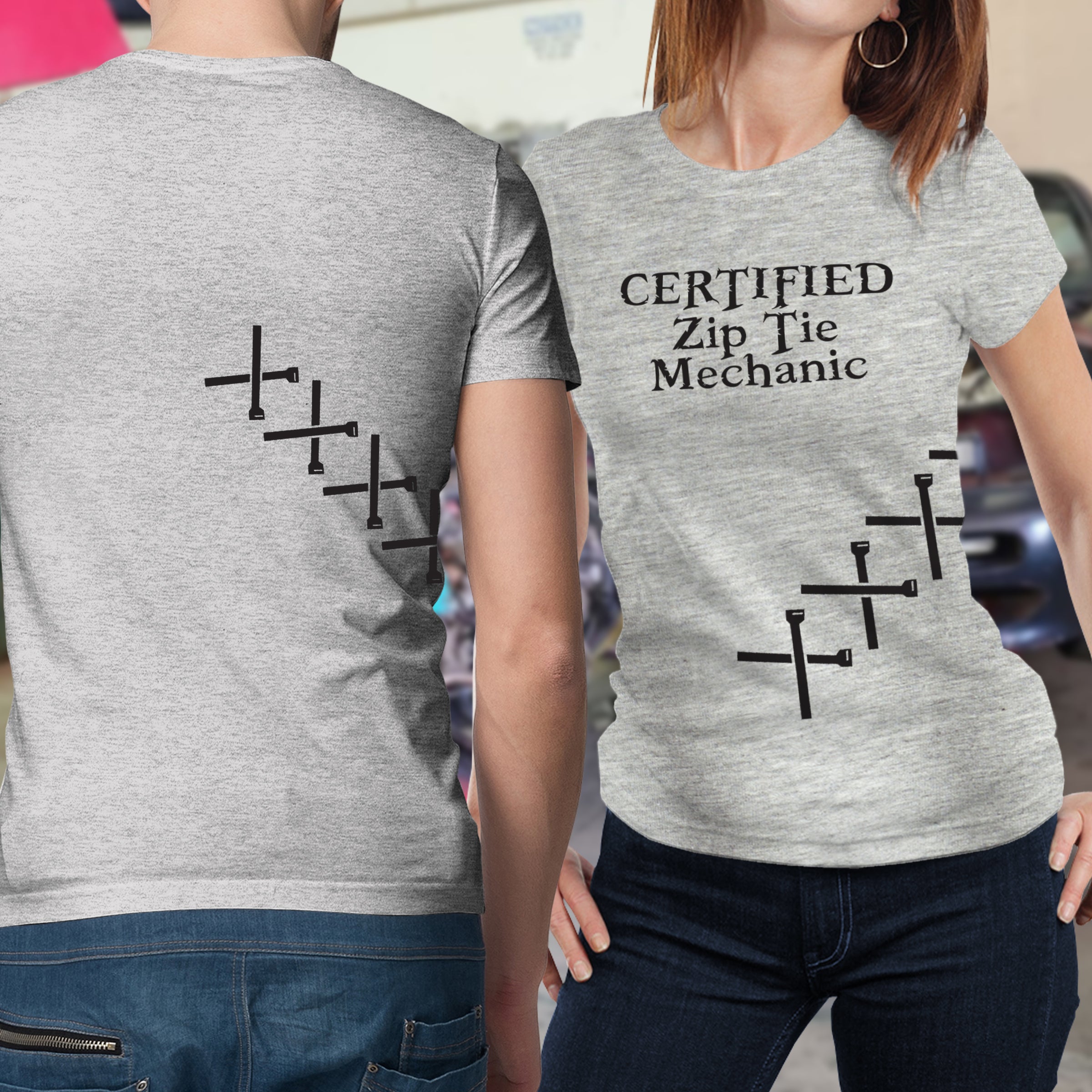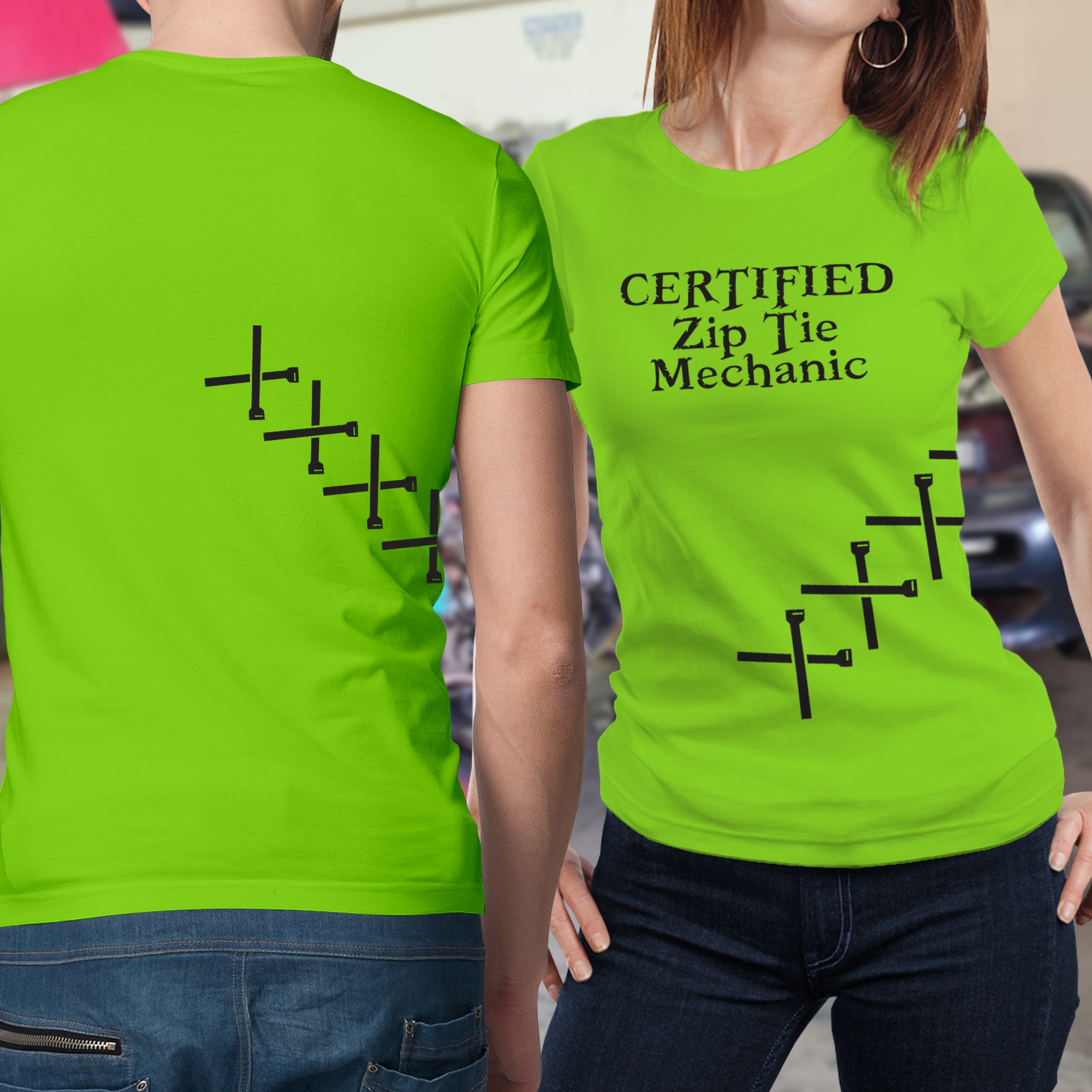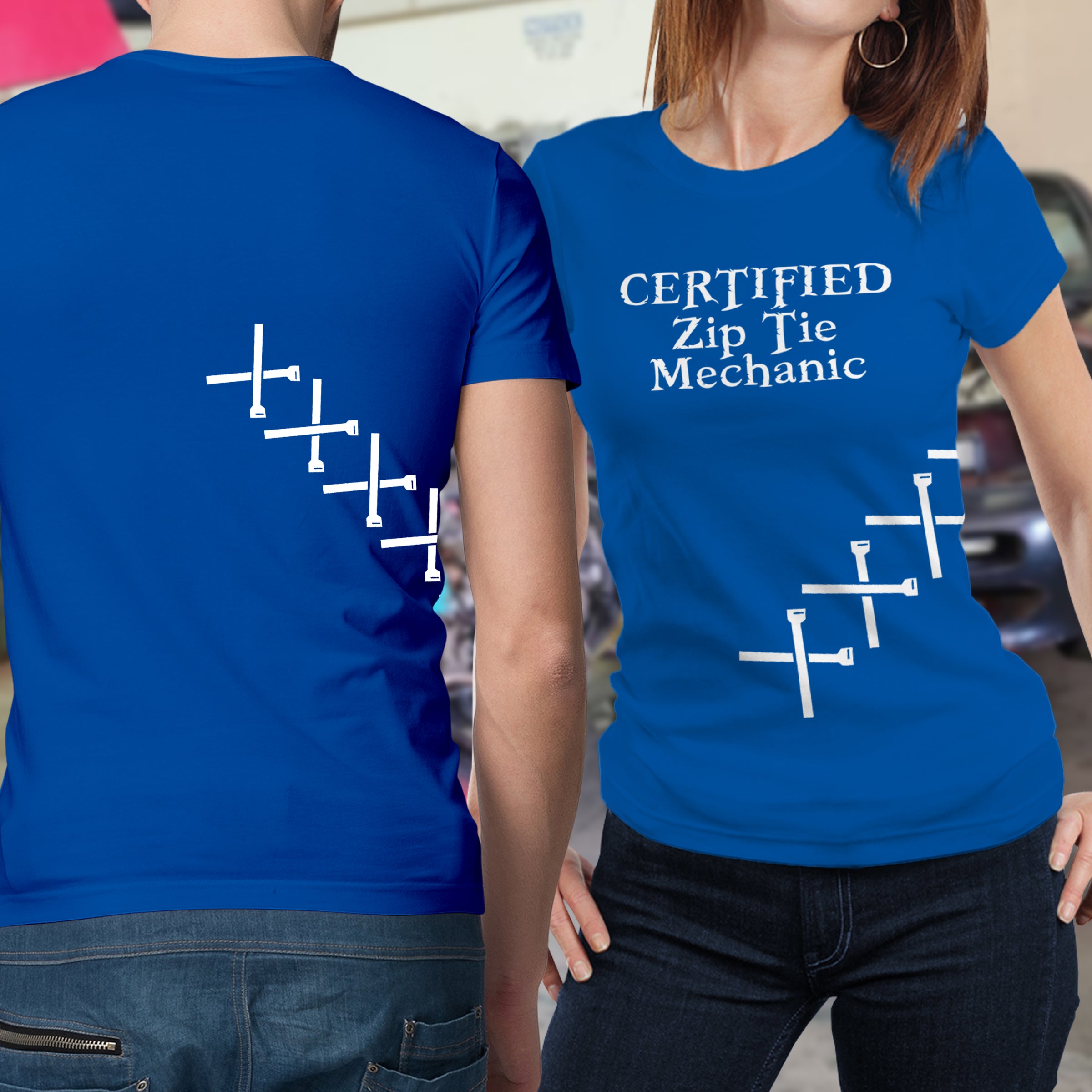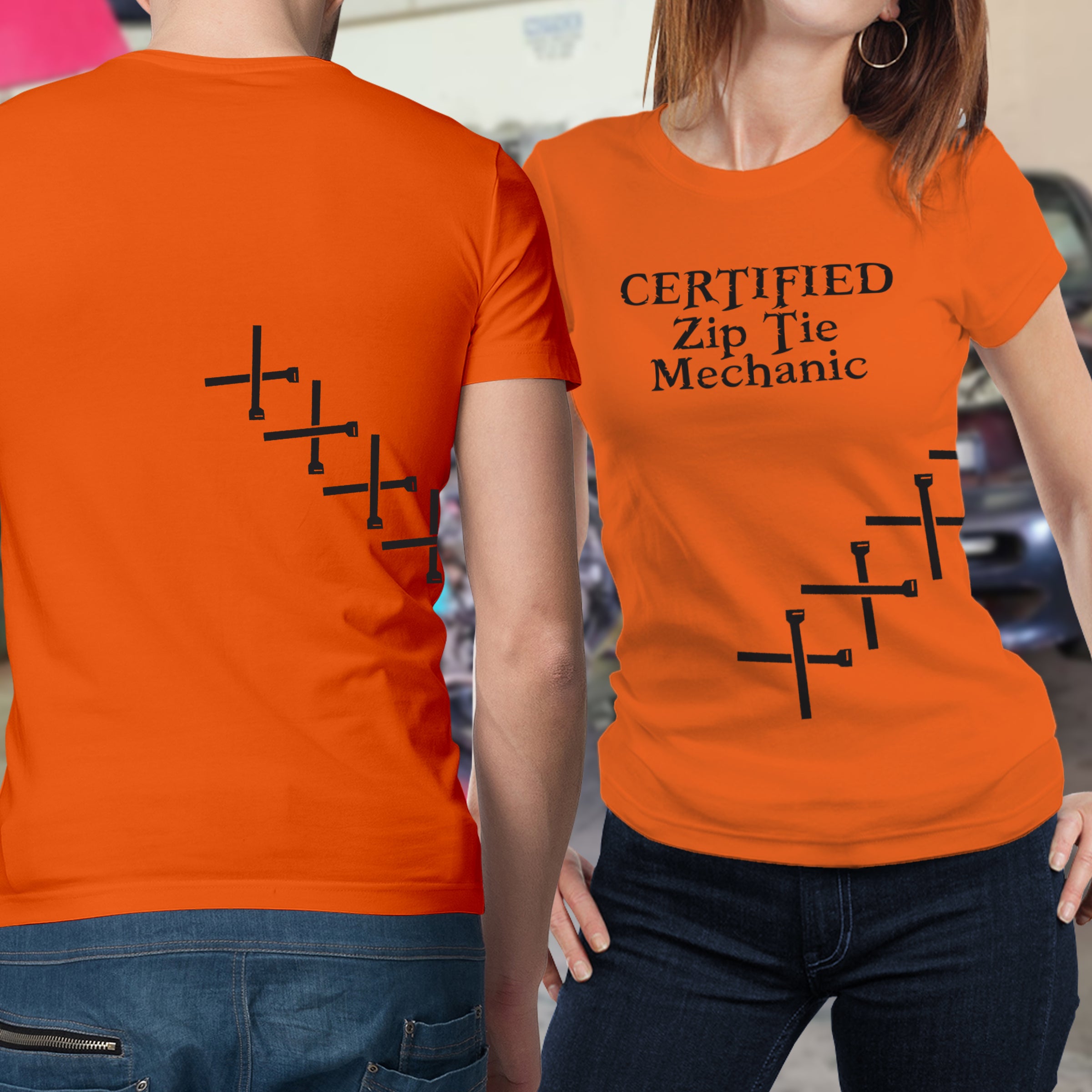 Ziptie Mechanic Shirt. All shirts are 100% Preshrunk cotton with a heat pressed digital printed image. Shirts are custom made to order.