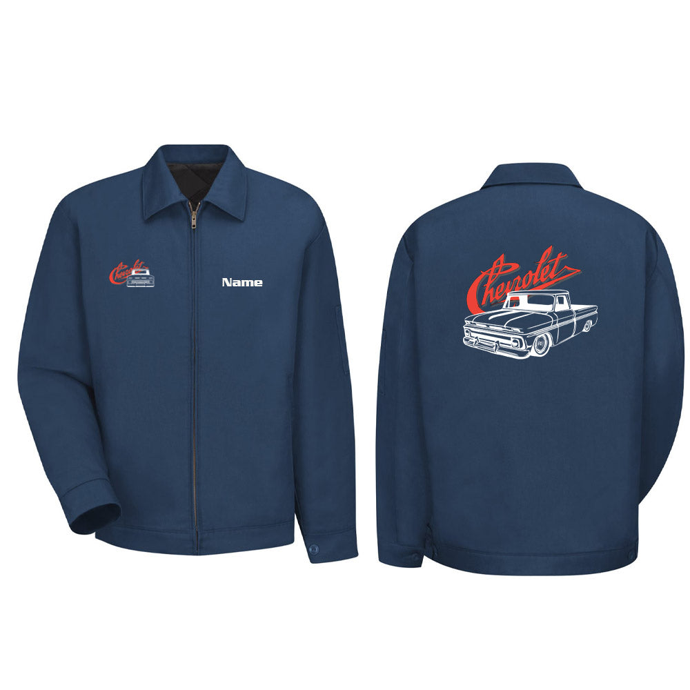 60-66 Chevy Truck Mechanic's Jacket with digital printed heat pressed image. Jackets are custom printed to order.