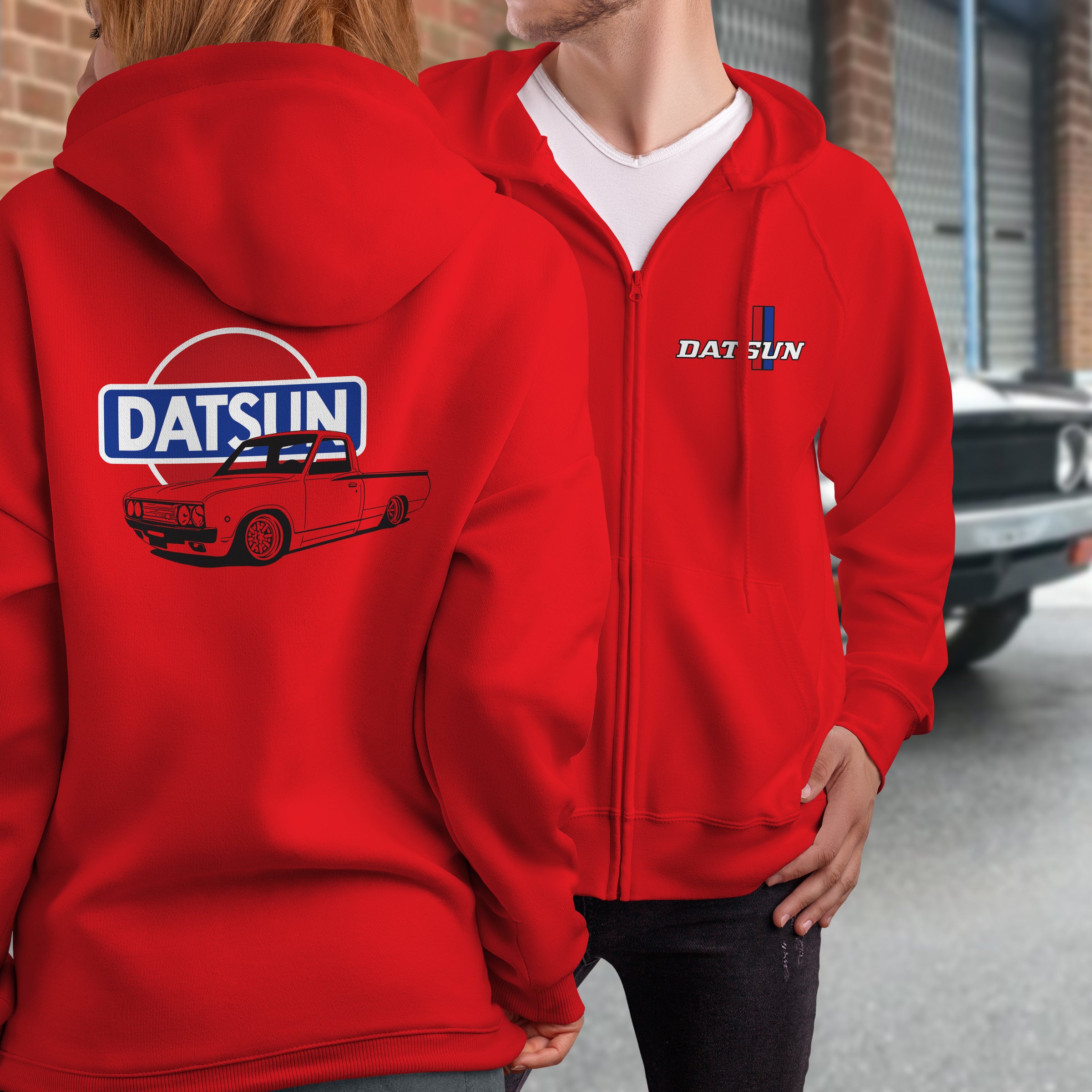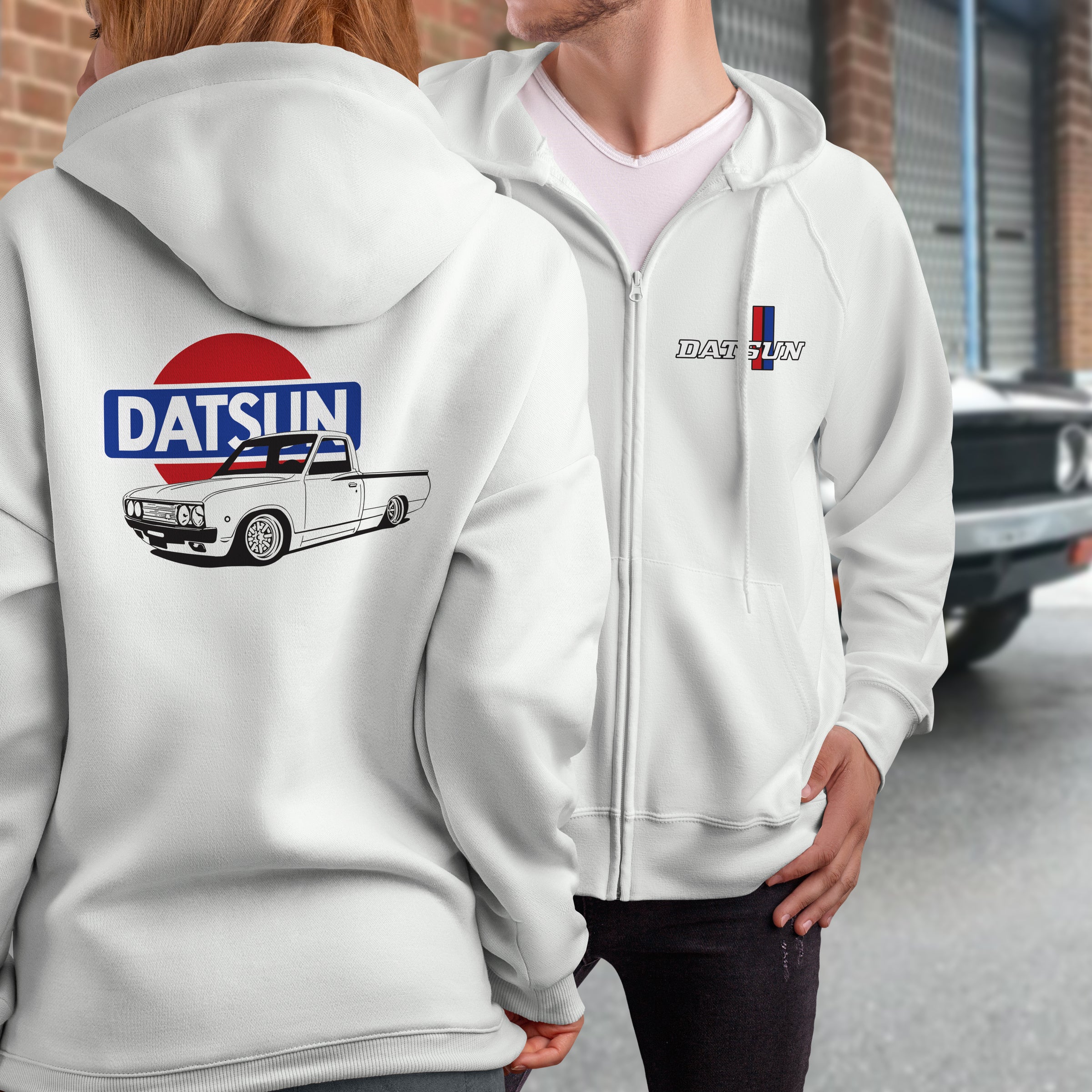 Datsun 620 Logo Full Zip Hoodie. Hoodies are Preshrunk 50% Cotton/50% Polyester blend with a heat pressed digital printed image. Hoodies are custom made to order.