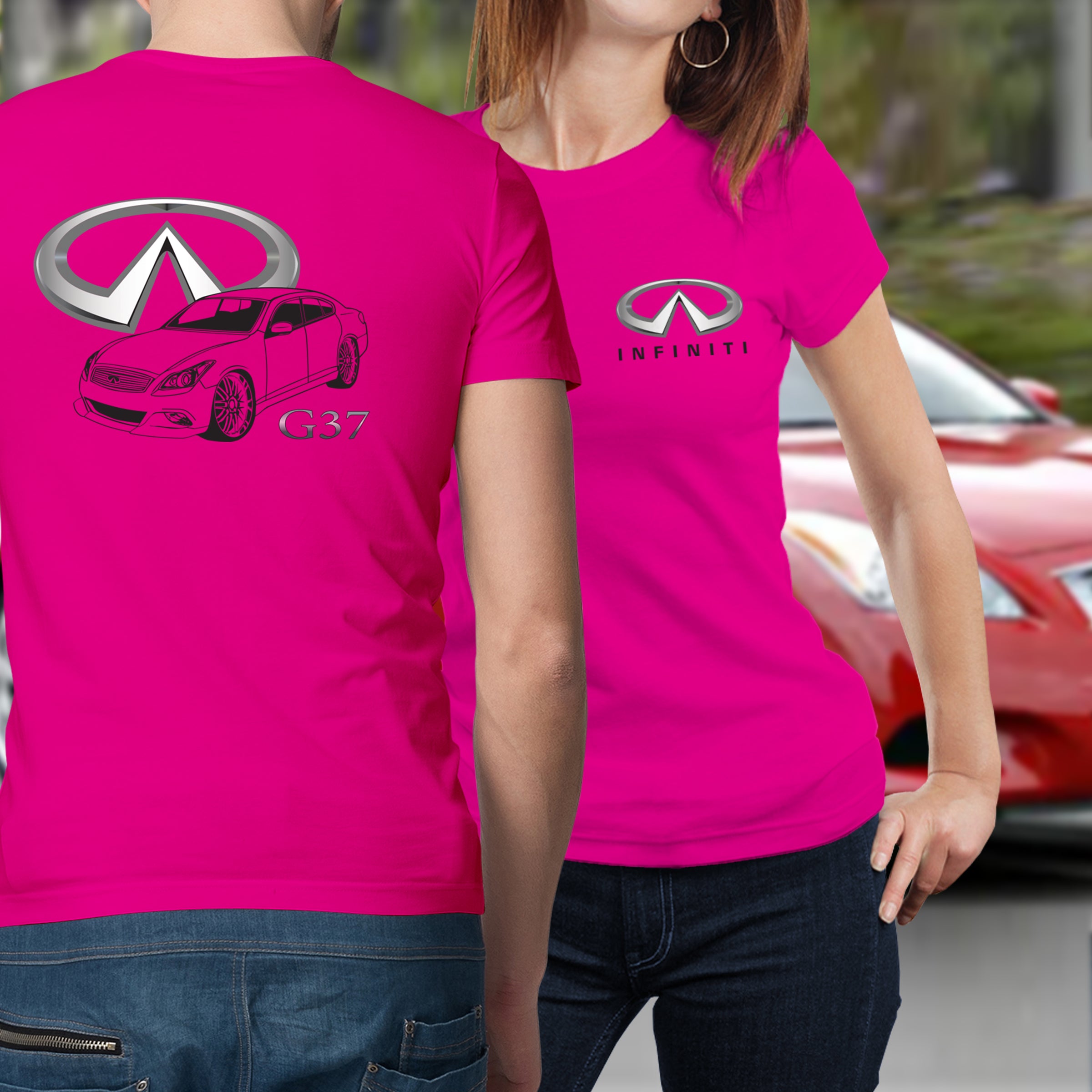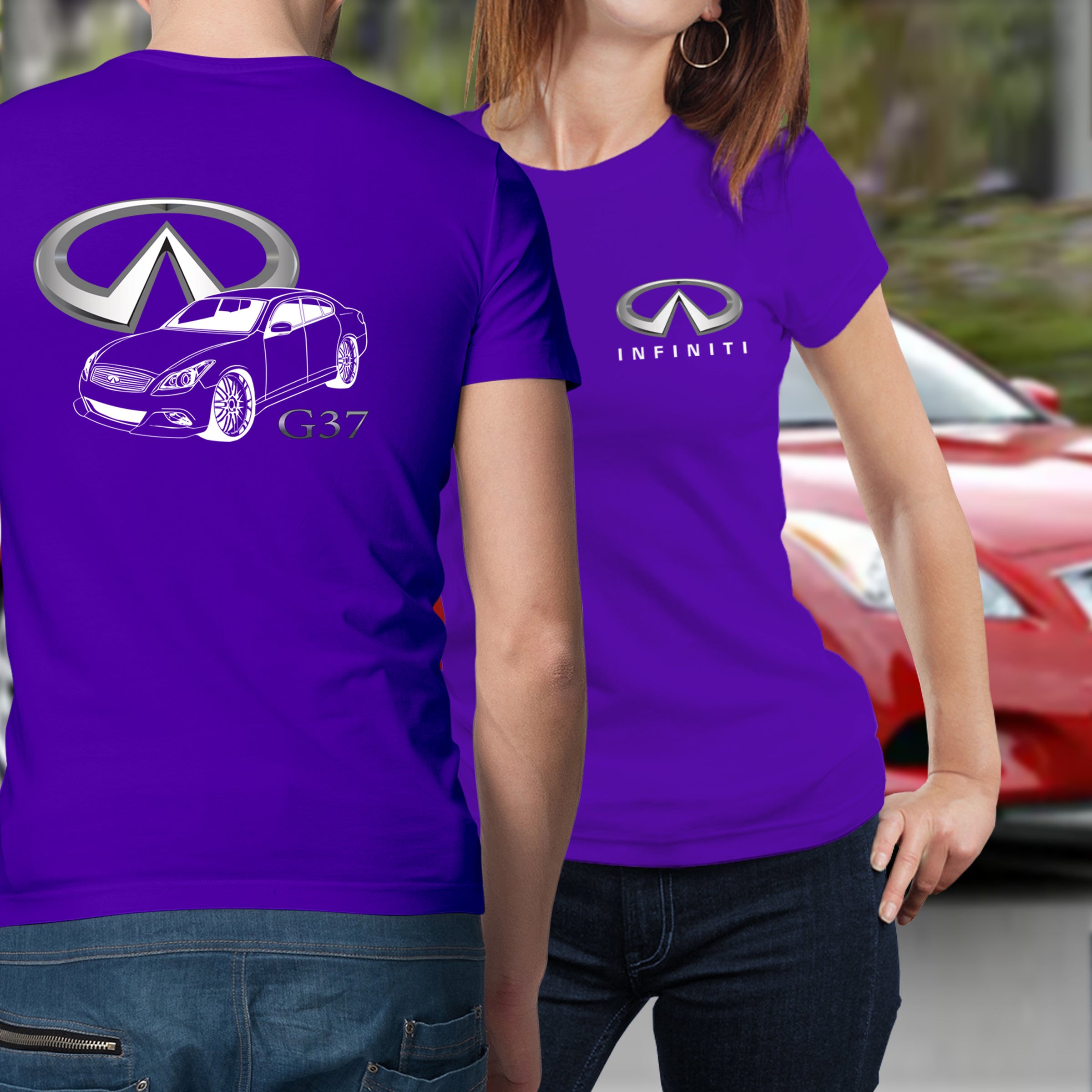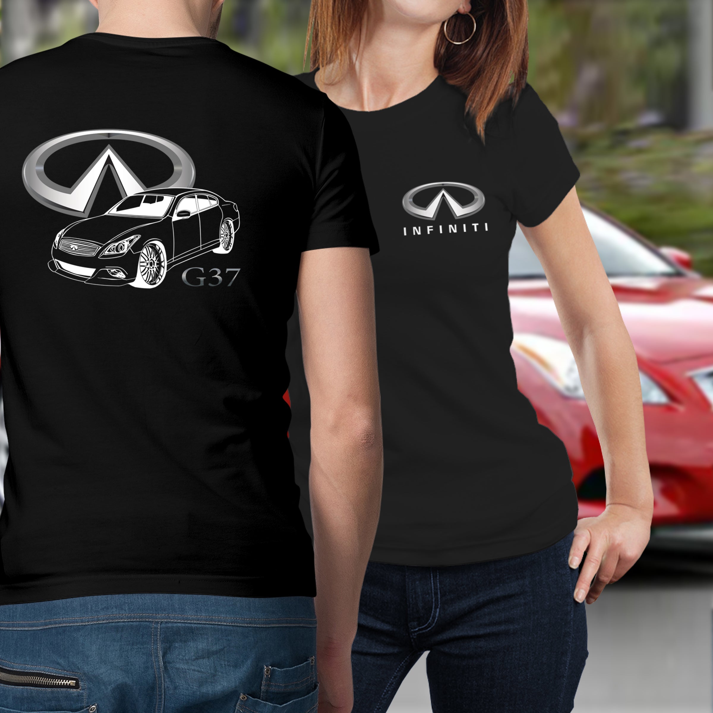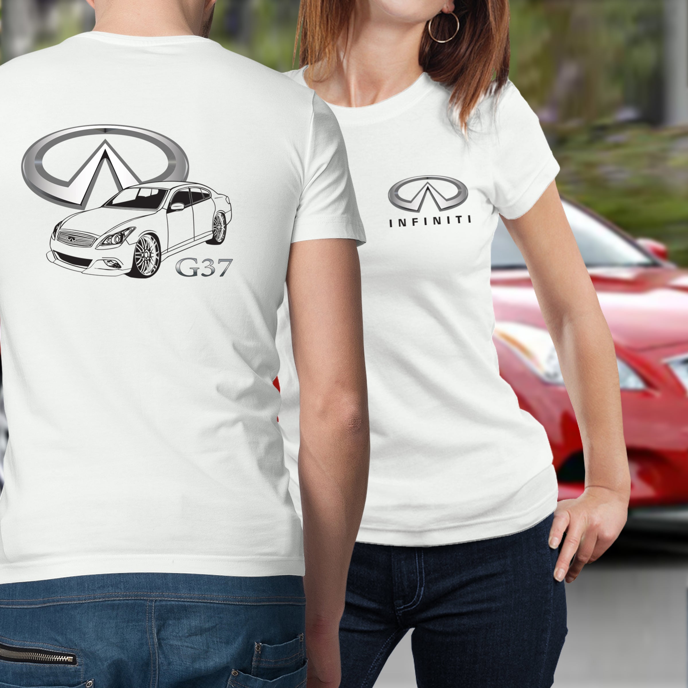 Infiniti G37 Sedan Logo Shirt.  All shirts are 100% Preshrunk cotton with a heat pressed digital printed image.  Shirts are custom made to order.