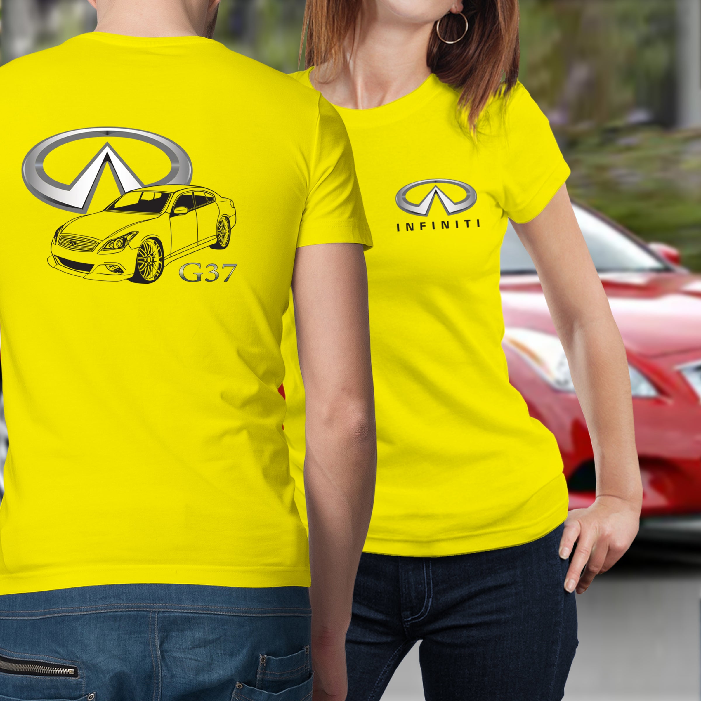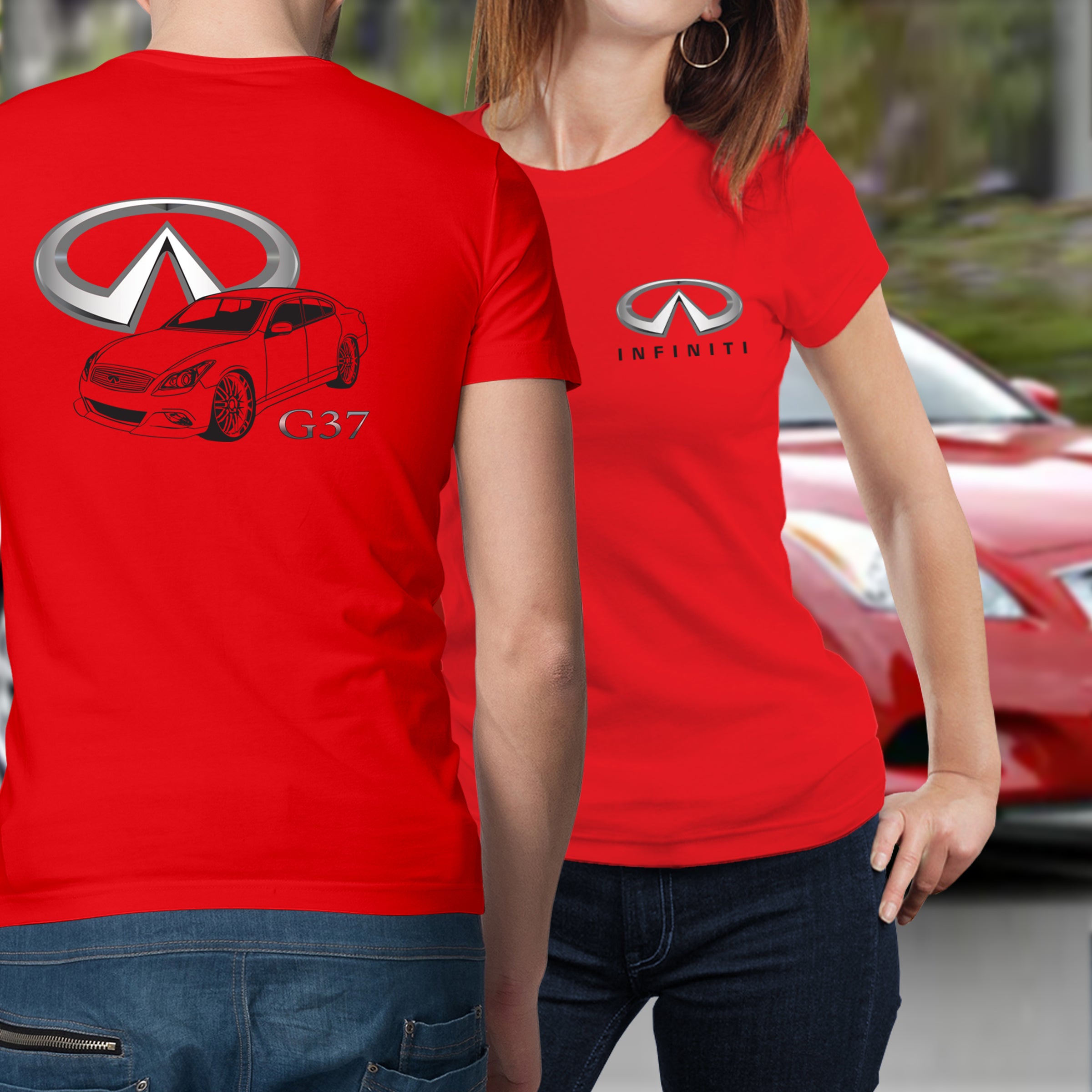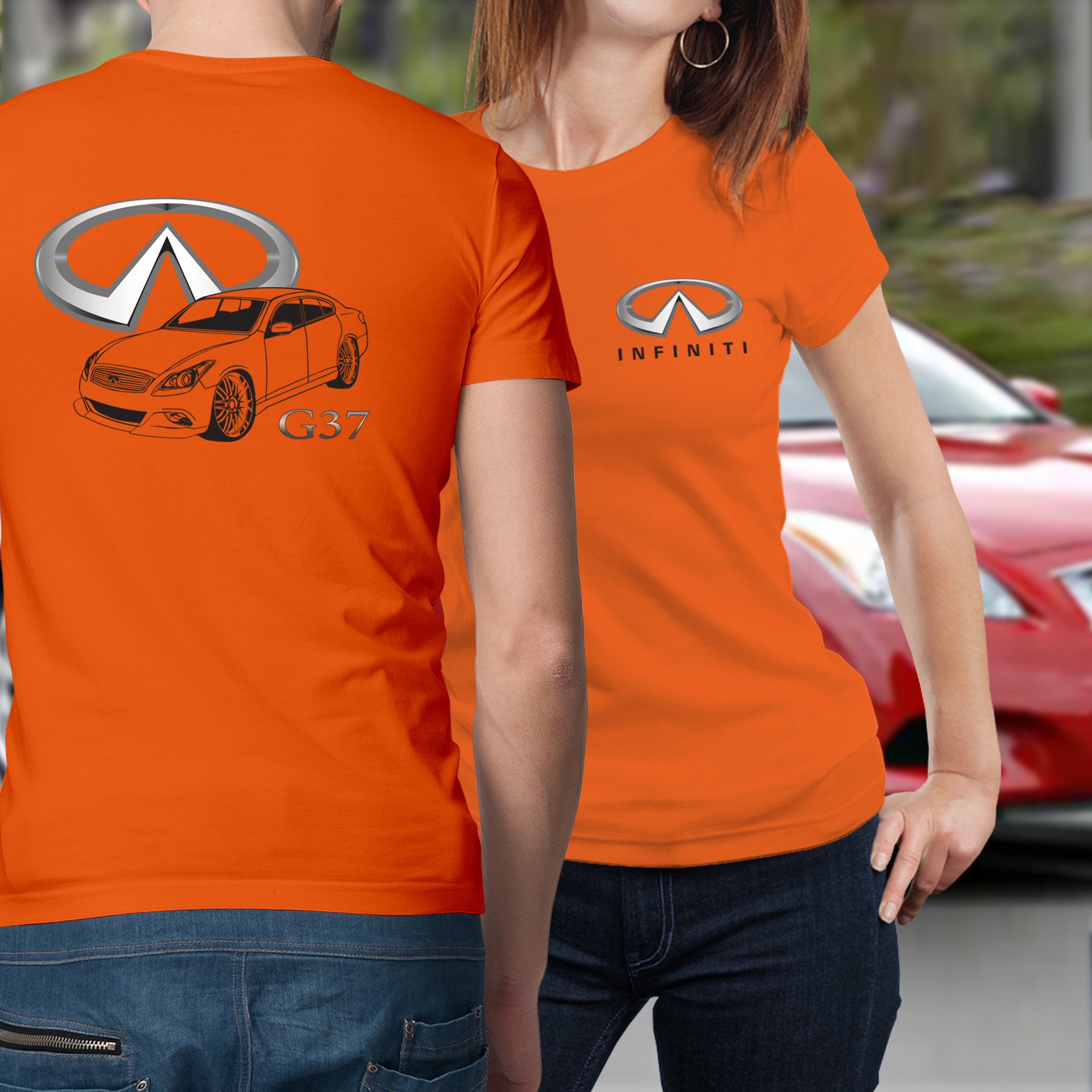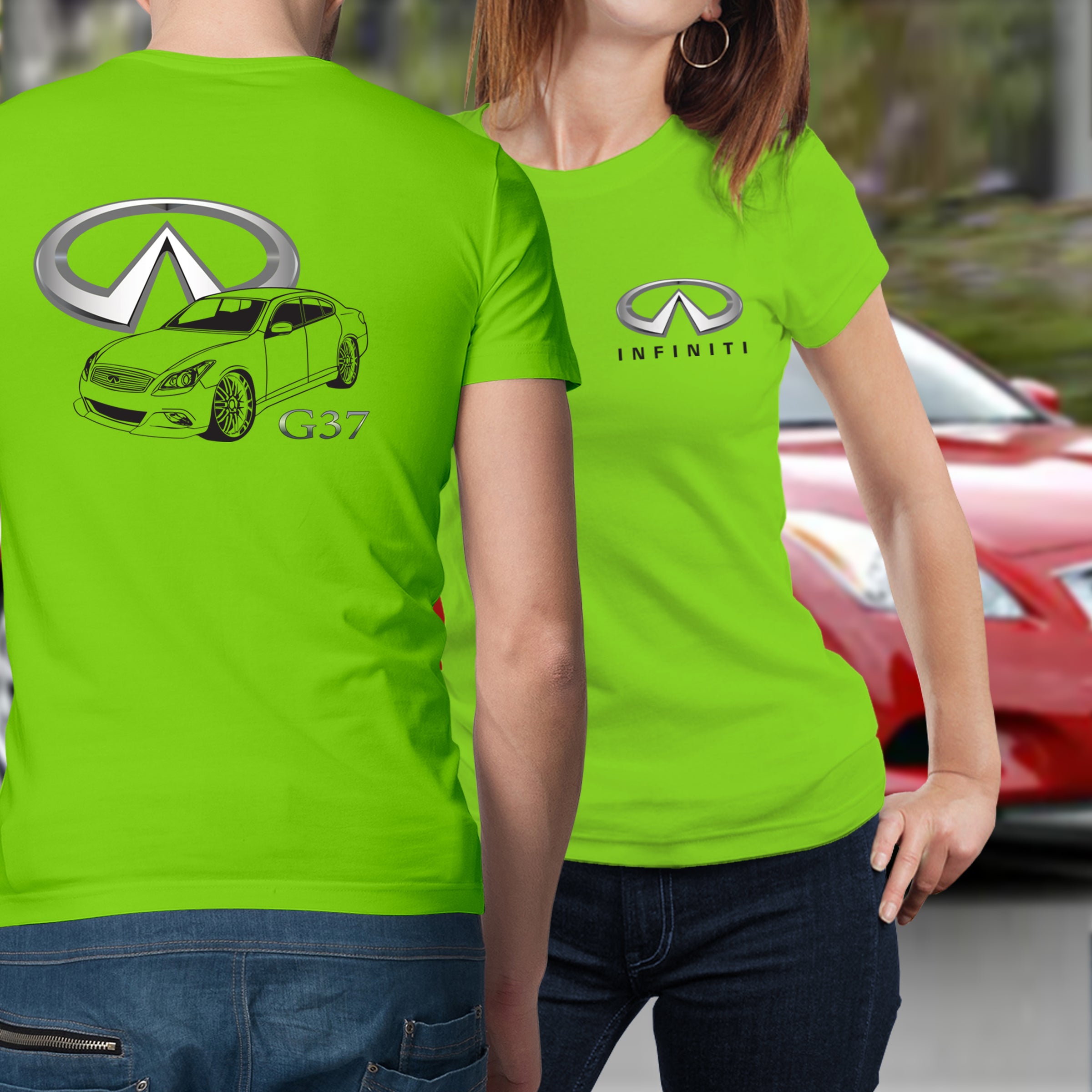 Infiniti G37 Sedan Logo Shirt.  All shirts are 100% Preshrunk cotton with a heat pressed digital printed image.  Shirts are custom made to order.